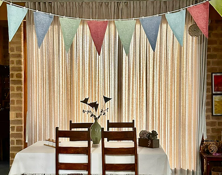 Buntings, originating in the 17th century, are now a timeless symbol of celebration. Made from eco-friendly natural fibers like banana, bamboo, hibiscus, vetiver, cotton, linen, and silk, they are strong, biodegradable, and lightweight. These sustainable, dual-sided buntings offer rustic charm and versatility, making them an environmentally conscious choice for year-round use or special occasions.